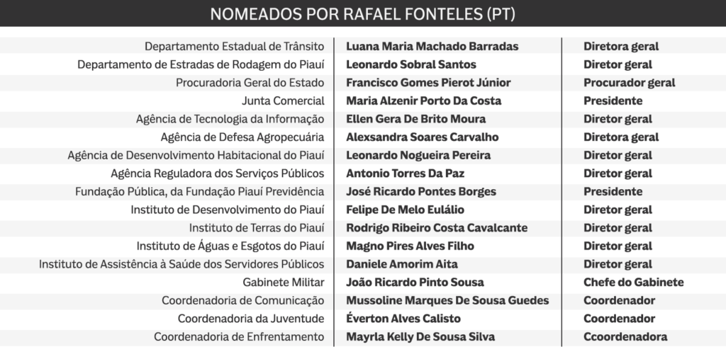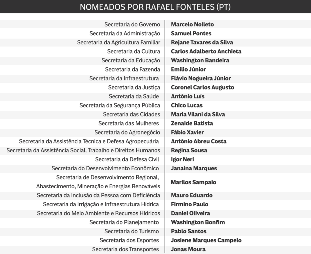 Desde novembro, quando foi eleito, Rafael divulgou pelas redes sociais e a conta-gotas os nomes que fariam parte da gestão estadual. Mudanças na estrutura do governo, extinção de órgãos, criação e incorporação de secretarias foram elencadas pelo governador como uma “estratégia de redução de cargos e custeio da máquina pública estadual”. No governo de Fonteles, a administração pública se divide em: 25 Secretarias, quatro Institutos Públicos, quatro Agências Públicas, três Coordenadorias, dois Departamentos, uma Fundação e um Gabinete Militar, além da Procuradoria Geral do Estado (PGE).