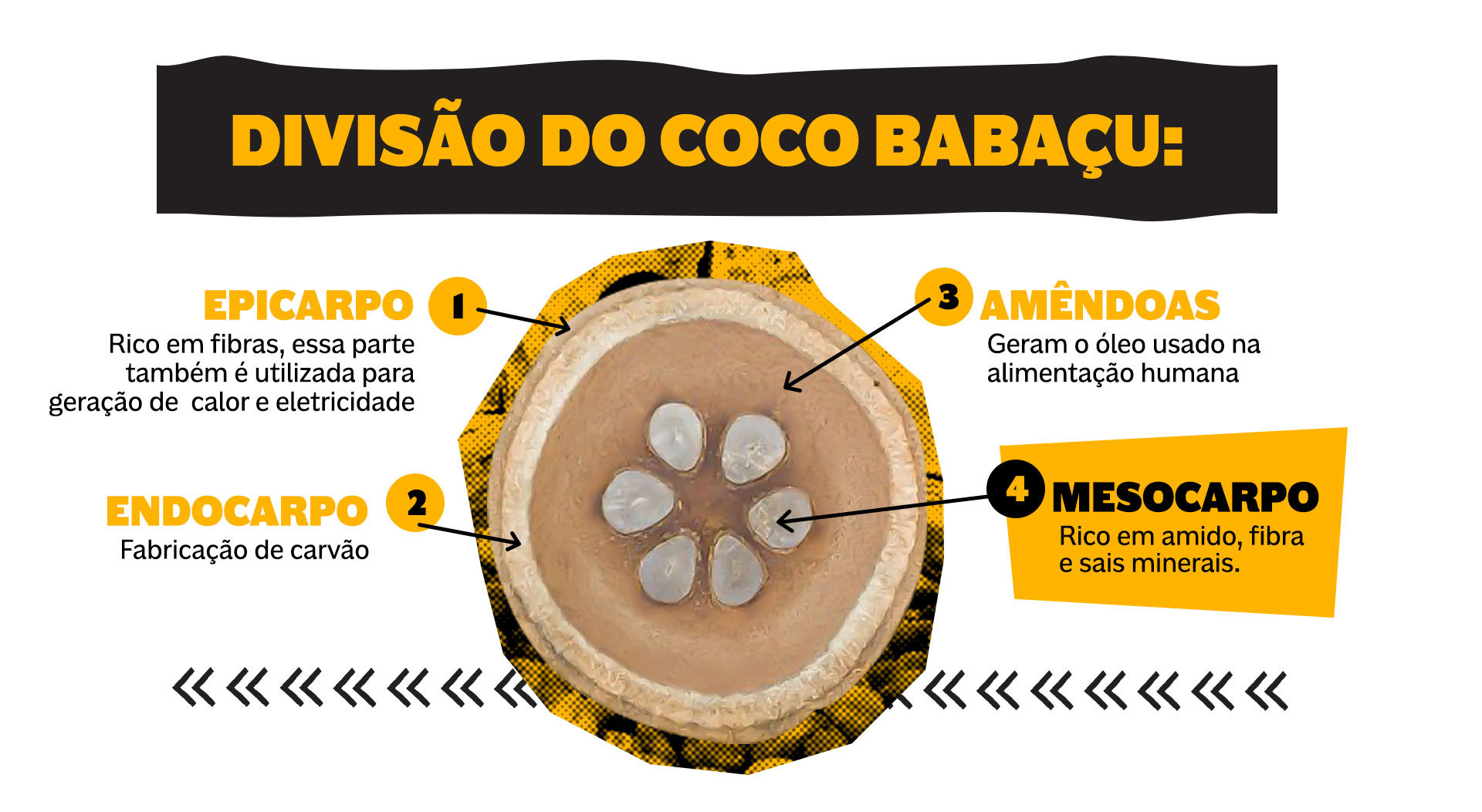 O babaçu é coletado entre as regiões de transição Amazônia, Cerrado e Caatinga no estado do Maranhão, Tocantins, Piauí e Pará. O mesocarpo é uma das partes do fruto usado tanto na suplementação da alimentação – empregado até mesmo na alimentação escolar através de sorvete, bolos e massas – como para tratamentos fitoterápicos.