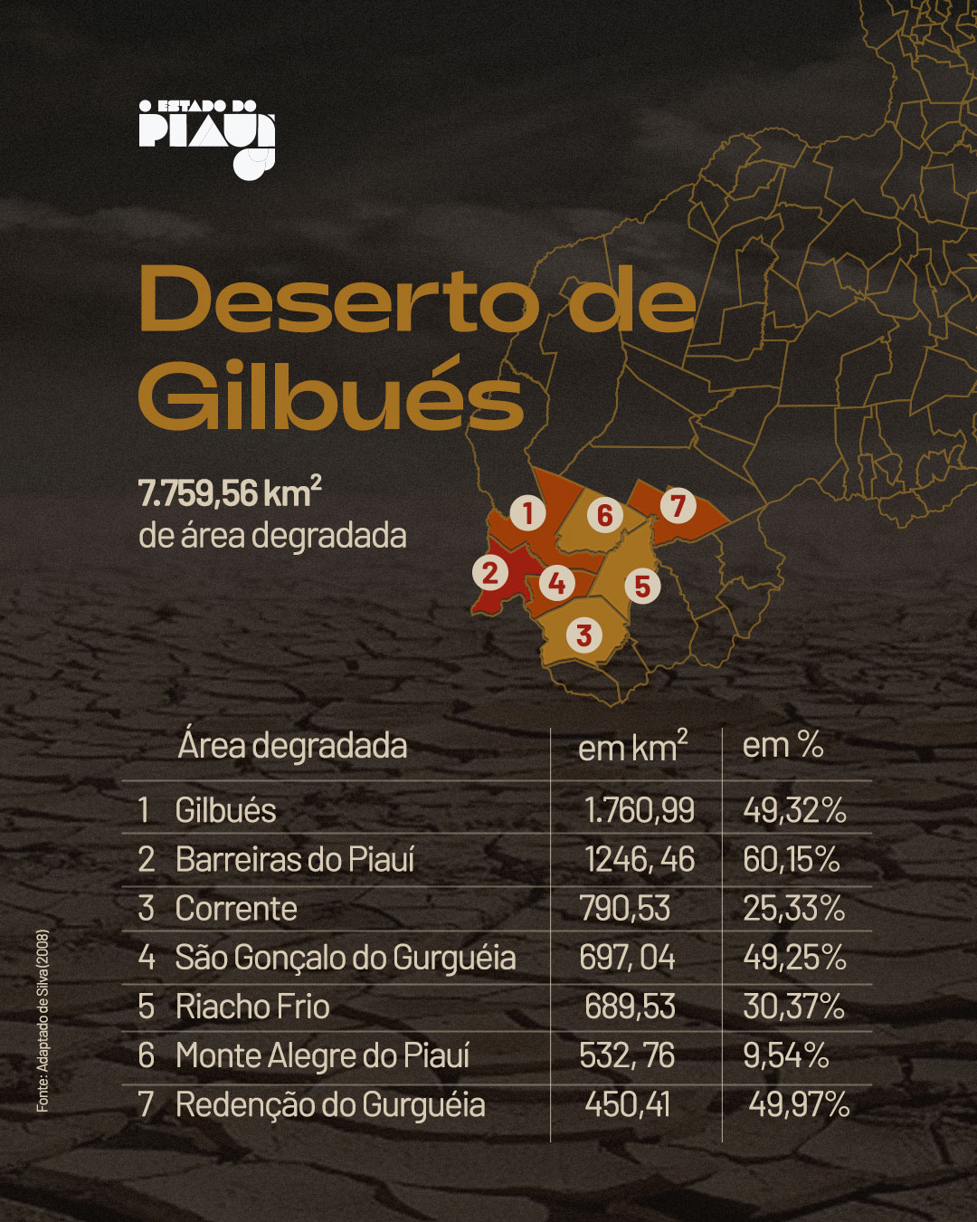 A região em que a família faz sua jornada é localizada no extremo sul do Piauí. Gilbués fica localizada quase na mesma distância de Brasília ou Teresina. São cerca de 766 quilômetros entre a cidade e a capital do estado – e 790 até a capital federal. É lá que possui uma das maiores áreas de solo desertificado do país. Sem cobertura vegetal, o solo rasgado por fendas e tomado pela vermelhidão, passou a ser chamado de “Deserto de Gilbués”.