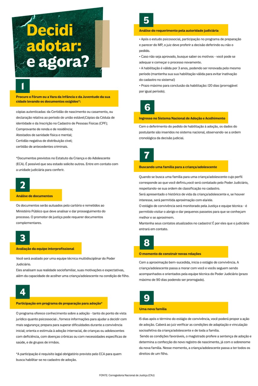 Ainda no início da pandemia, em 2020, diversos órgãos em conjunto com o Conselho Nacional de Justiça assinaram a Recomendação nº1/2020 com o objetivo de garantir a oferta dos serviços de Adoção e Acolhimento, além de evitar o fechamento das unidades de acolhimento institucionais. No mesmo ano, foi aprovado o ato normativo para que os tribunais passassem a realizar audiências e outros atos processuais, em uma tentativa de dar maior agilidade aos processos de adoção.