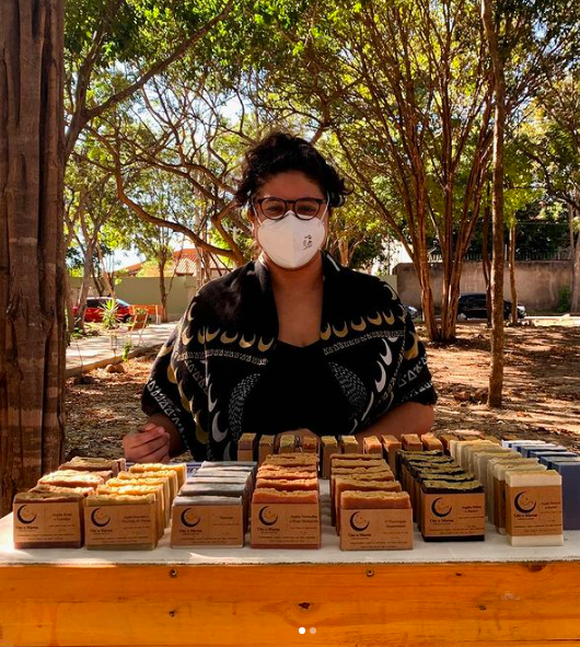 Mariana Moura é uma das organizadoras da feirinha, que surgiu da iniciativa de amigos empenhados em unir sustentabilidade, uso de espaços subaproveitados e convívio seguro em tempos de pandemia. Ela também aproveita para comercializar sua produção de base artesanal: sabonetes e cosméticos com matéria-prima de origem vegetal e mineral. (@ceuemaresnatural)