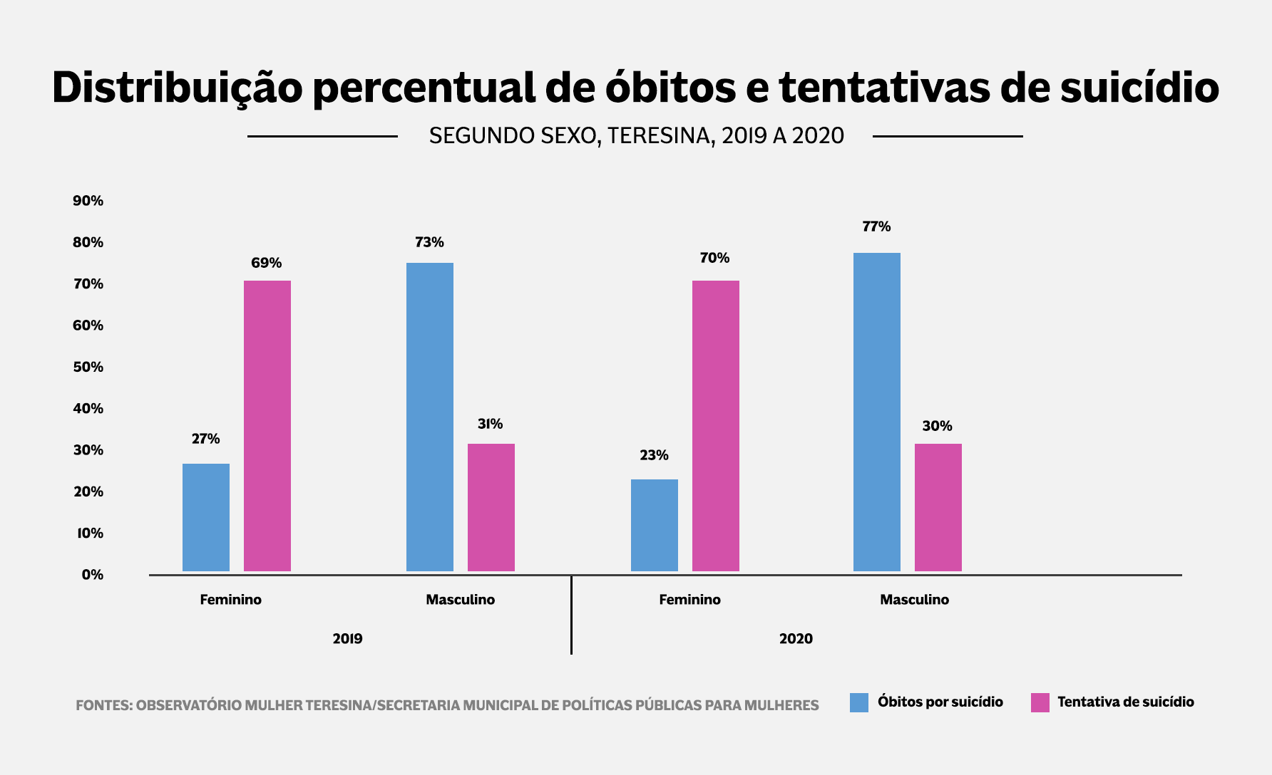 Entre os anos de 2019 e 2020, Teresina registrou, no entanto, uma queda nos casos de suicídios. De acordo com dados do Sistema de Informações sobre Mortalidades (SIM) fornecidos pela Fundação Municipal de Saúde (FMS), os homens representam mais de 73% dos casos. Porém, na capital, as mulheres apresentaram as maiores tentativas de suicídio nos últimos dois anos, com índice de aumento em 2020.
