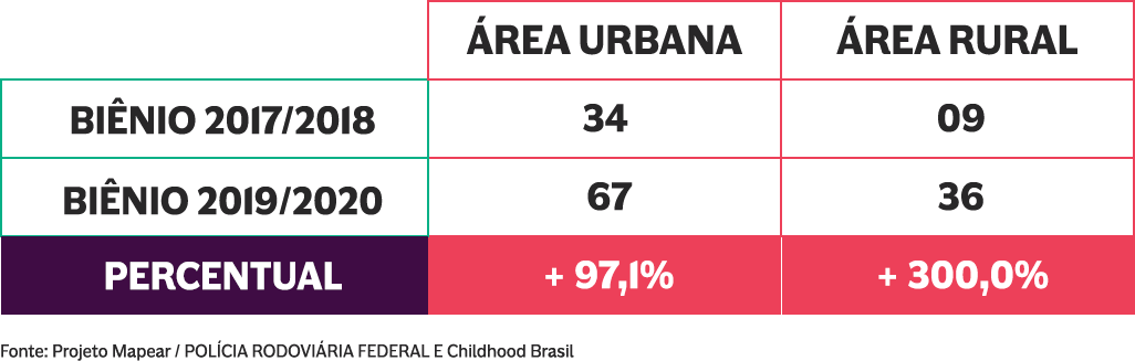 O novo estudo revelou um aumento na vulnerabilidade para exploração sexual infantil na zona rural, que contabilizou 300% (36 pontos). Na zona urbana também houve crescimento – e continua sendo a maior incidência de risco, com 97,1% (67 pontos).
