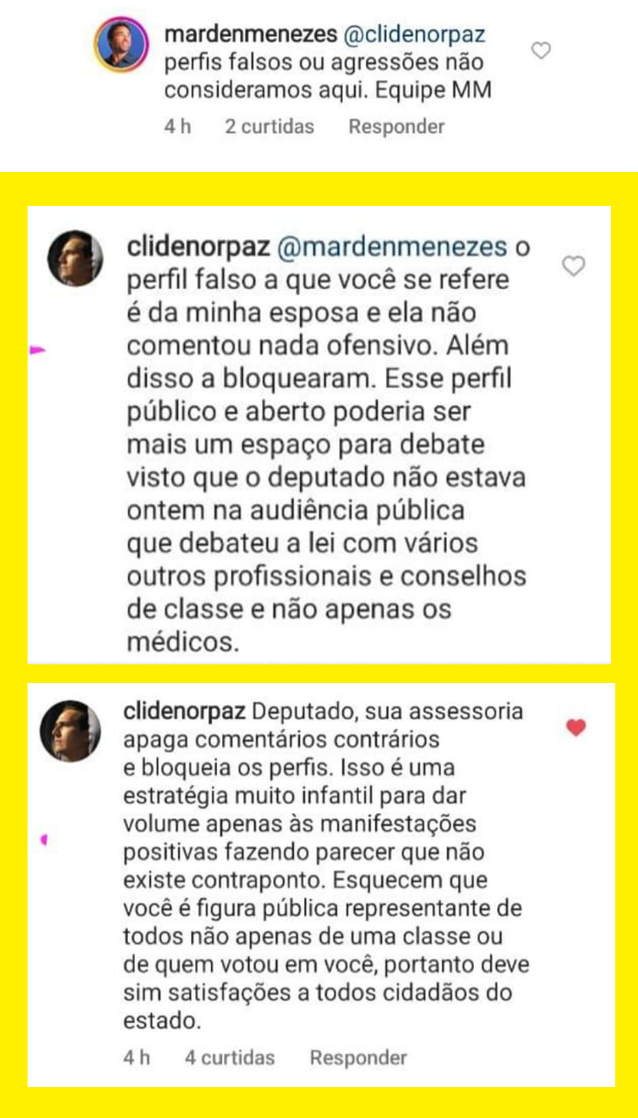 No fim de semana, o deputado estadual Marden Menezes (PP) bloqueou mulheres que comentavam os conteúdos postados em suas redes sociais. “O deputado está espalhando inverdades sobre a Lei 7750 aprovada pelo governo estadual”, disse Rayana Agrélio no Instagram. “Ao comentar seu post desmentindo suas falas e discordando dele, ele me bloqueia. A quem interessa calar as mulheres?”.
