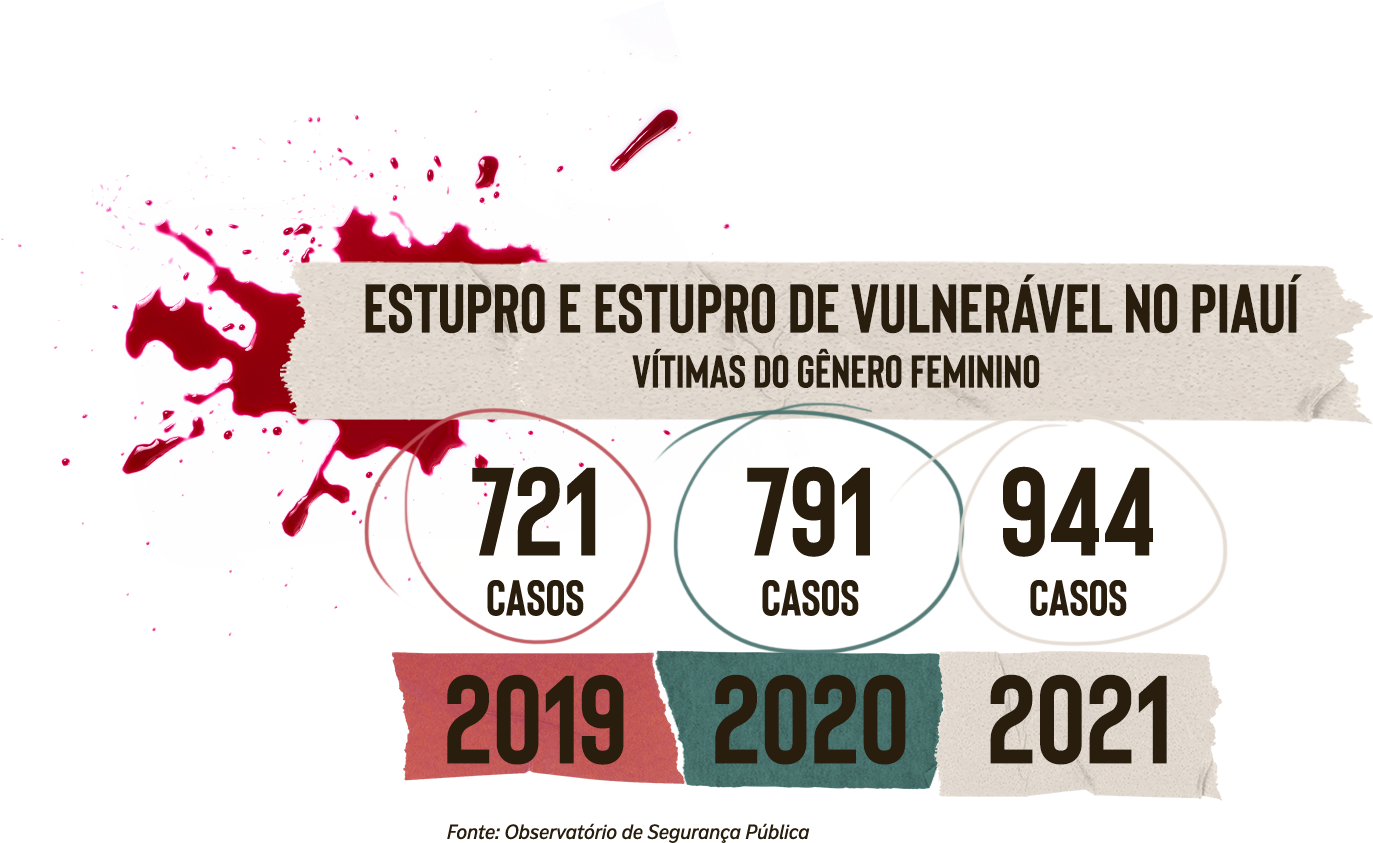 Novamente o Piauí figura entre os estados que mais tiveram aumentos no registro de estupros de mulheres em 2021. Os maiores destaques são: Paraíba (111,3%) , Maranhão (46,6%), Alagoas (23,5%) e Piauí, com aumento de 19,3%.