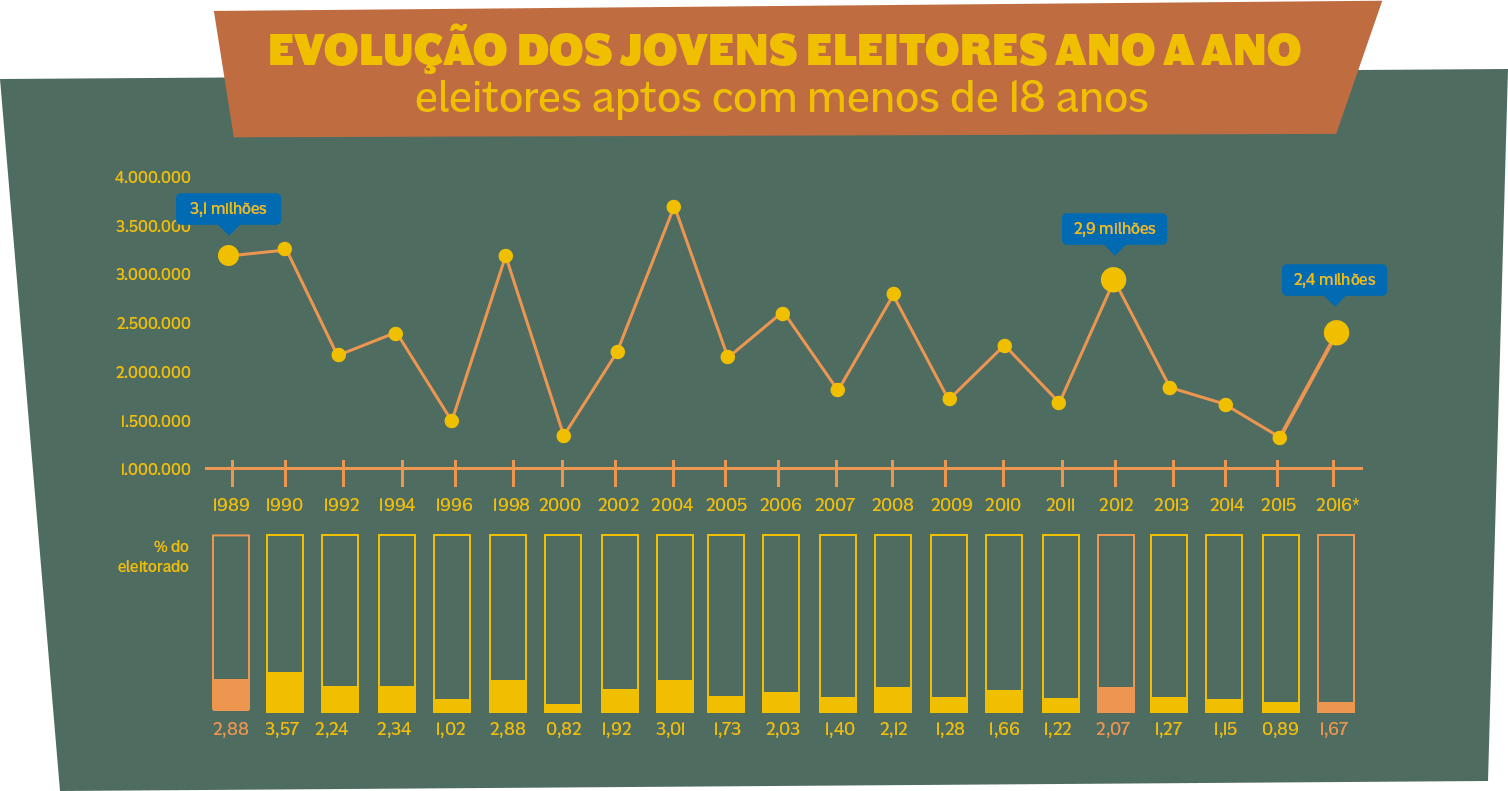 Os números chamam atenção, em especial quanto aos jovens com 16 e 17 anos, grupo para o qual o voto é facultativo. Em março, o eleitorado total apto a votar nessa faixa etária girava em torno de 700 mil (17 anos) e pouco mais de 300 mil (16 anos). Esse quantitativo teve um crescimento significativo em abril (54,3%), indo para mais de 1,6 milhões de jovens (16 anos) e mais de 1,3 milhões (17 anos).