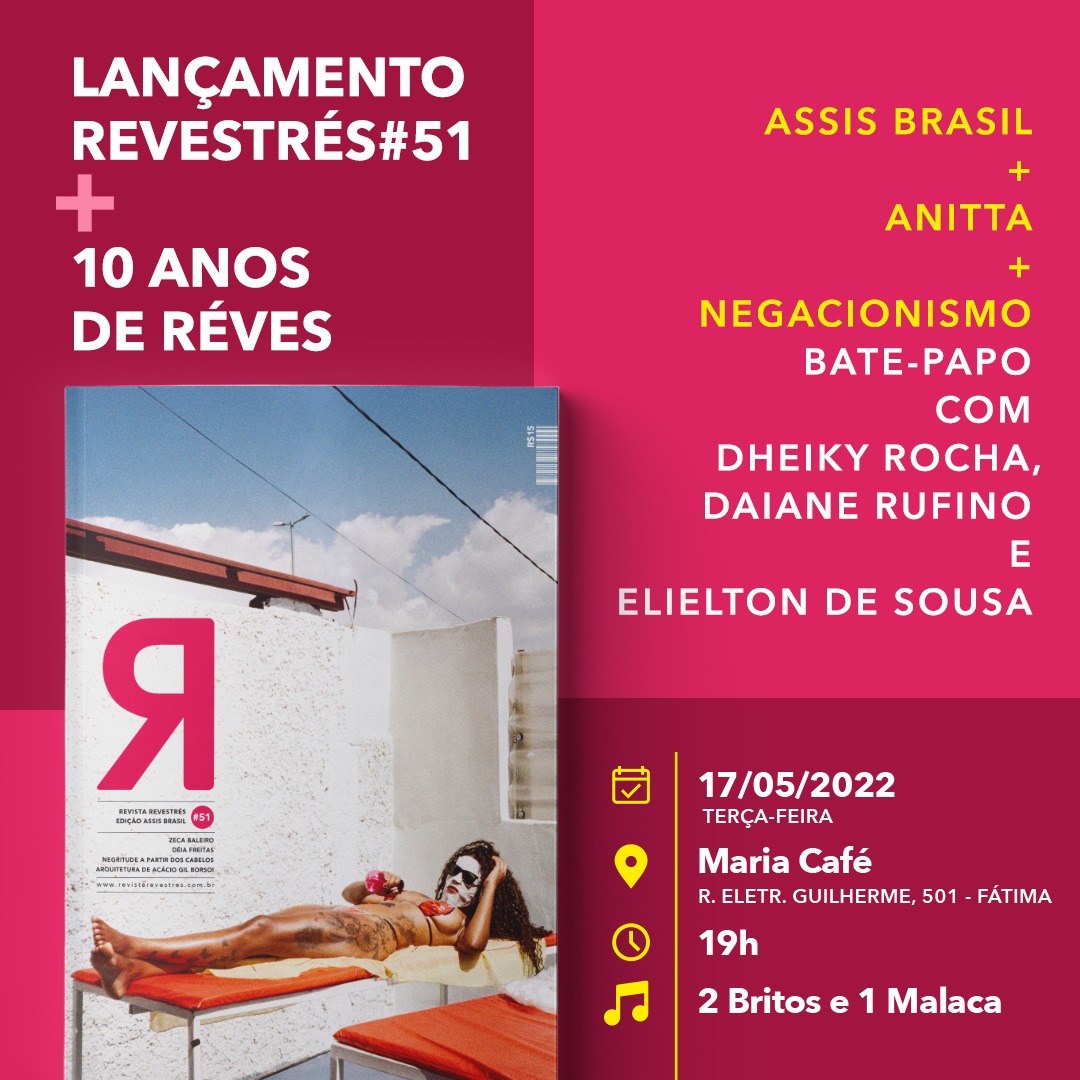 Chega às bancas a 51° edição da Revestrés. Neste ano, a revista piauiense faz 10 anos de circulação no Brasil e realiza o lançamento da mais nova edição com um bate-papo com os articulistas que escrevem neste número: os professores Dheiky Rocha, Daiane Rufino e Elielton de Sousa, que vão falar, respectivamente, sobre Assis Brasil – o homenageado da edição-, Anitta e estética da favela e Negacionismo e ignorância como política. A música ficara por conta de 2 Britos e 1 Malaca.
