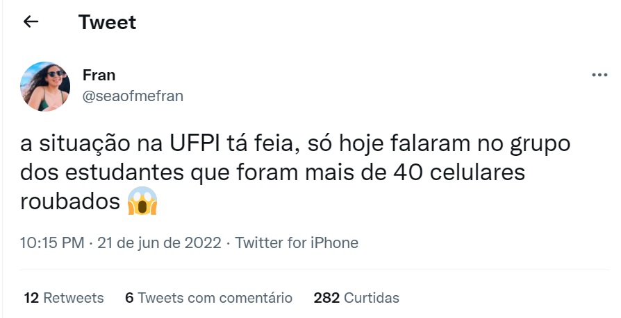 A volta para casa, após quase dois anos sem aulas presenciais na Universidade Federal do Piauí (UFPI), é um novo desafio na vida dos estudantes da instituição. No Campus Ministro Petrônio Portella, na zona Leste de Teresina, estudantes reclamaram da insegurança vivida nos setores da universidade. Nas paradas de ônibus dos Centros de Tecnologia (CT), Ciência da Educação (CCE) e Ciências Humanas e Ciência Humanas e Letras (CCHL), arrastões aconteceram pela tarde e noite durante segunda e terça-feira (21).
