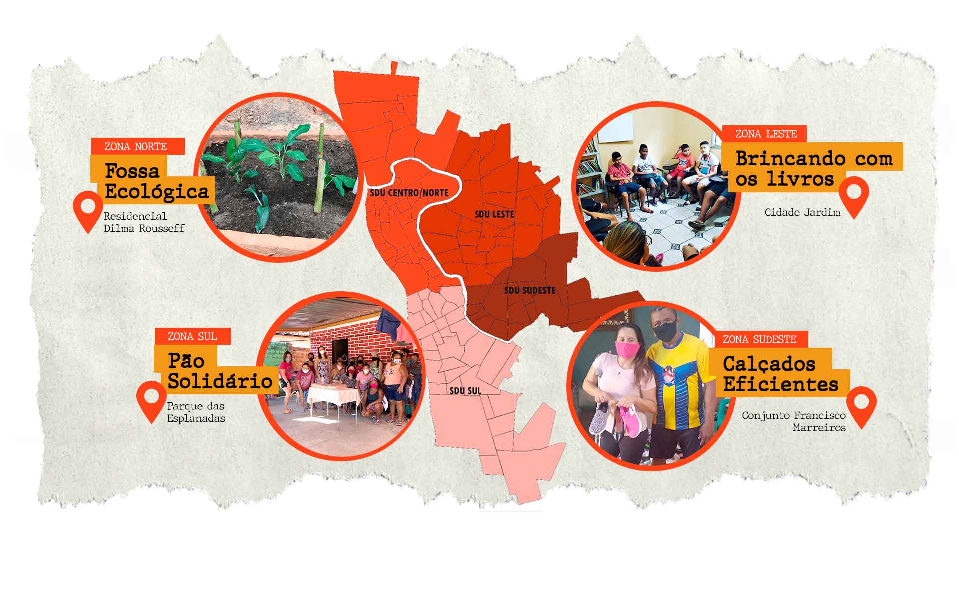 Mesmo com tantas dificuldades, individuais ou coletivas, Teresina possui diversos projetos mobilizados pelas comunidades para superar carências e anseios de tantos grupos múltiplos na capital. Apesar das estatísticas de violência, fome e desemprego, nos quatro cantos da cidade – Norte, Leste, Sudoeste e Sul – grupos dividem suas rotinas de trabalho ou estudos na tentativa de mudar, mesmo que minimamente, a realidade de vizinhos, do bairro e da região a qual pertencem. Conheça algumas histórias a seguir.