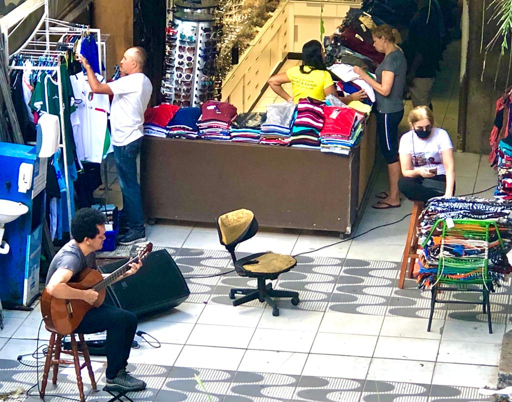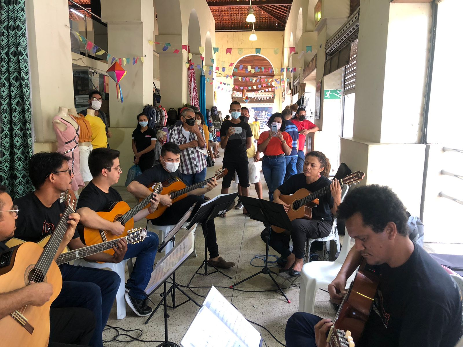 O vento de julho, o barulho da feira, o entra e sai de pessoas no meio do comércio. O cenário parecia até comum para um mercado, não fosse pelo som dos violões rompendo o meio-dia. Lojistas, comerciantes e transeuntes sacavam os celulares para registrar o acontecimento: uma orquestra de violões em pleno mercado central.